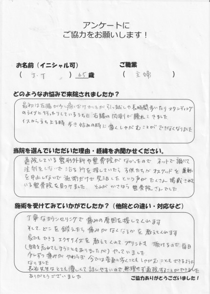 痛みの原因や家でできる筋力強化を教えて頂けて、薬や注射ではなく治していけることがわかりました。整形外科では「かれい」のせいで膝が痛くなると言われましたが、実は違っていました。