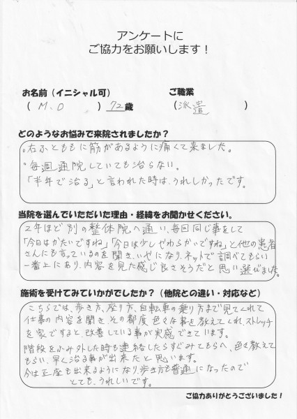 どのようなお悩みで来院されましたか? 右膝痛のため歩行に支障をきたし、階段では手すりがないと不安であった。(特に降りる時) 整形外科に3年通っても効果なし。 当院を選んだ理由・経緯をお聞かせください。 新聞のチラシを見て一度体験するつもりで来院した。 長谷さんの的確なアドバイスで通院することにした。 施術を受けてみていかがでしたか? 痛みは完全に解消された訳ではないが、歩行がスムーズになり、犬との散歩時には小走り程度なら回復し、歩くスピードも戻りつつあり。